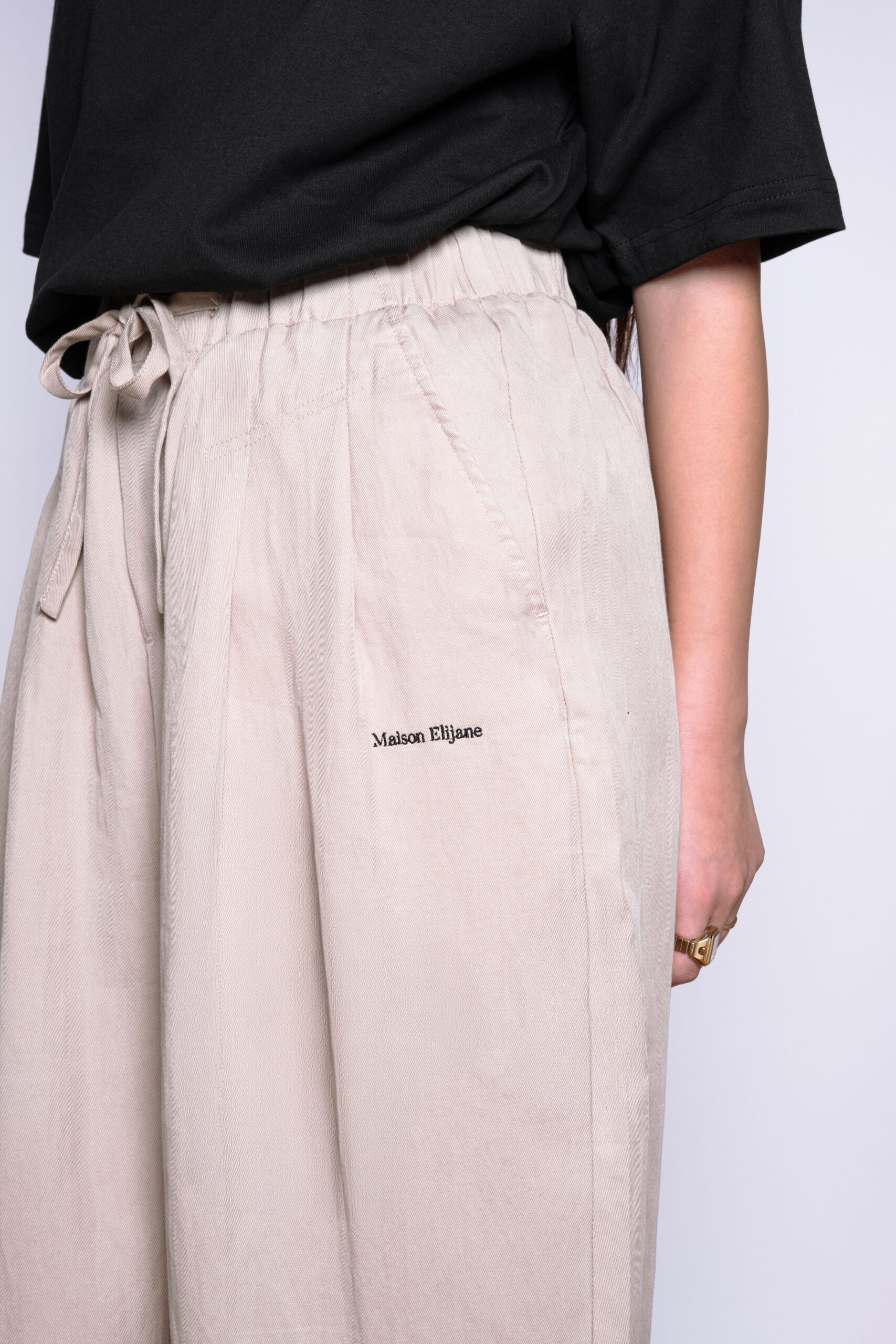La poche arrière du pantalon TRACE est ornée d’une broderie “ME” en marron chocolat, signature subtile de Maison Elijane.