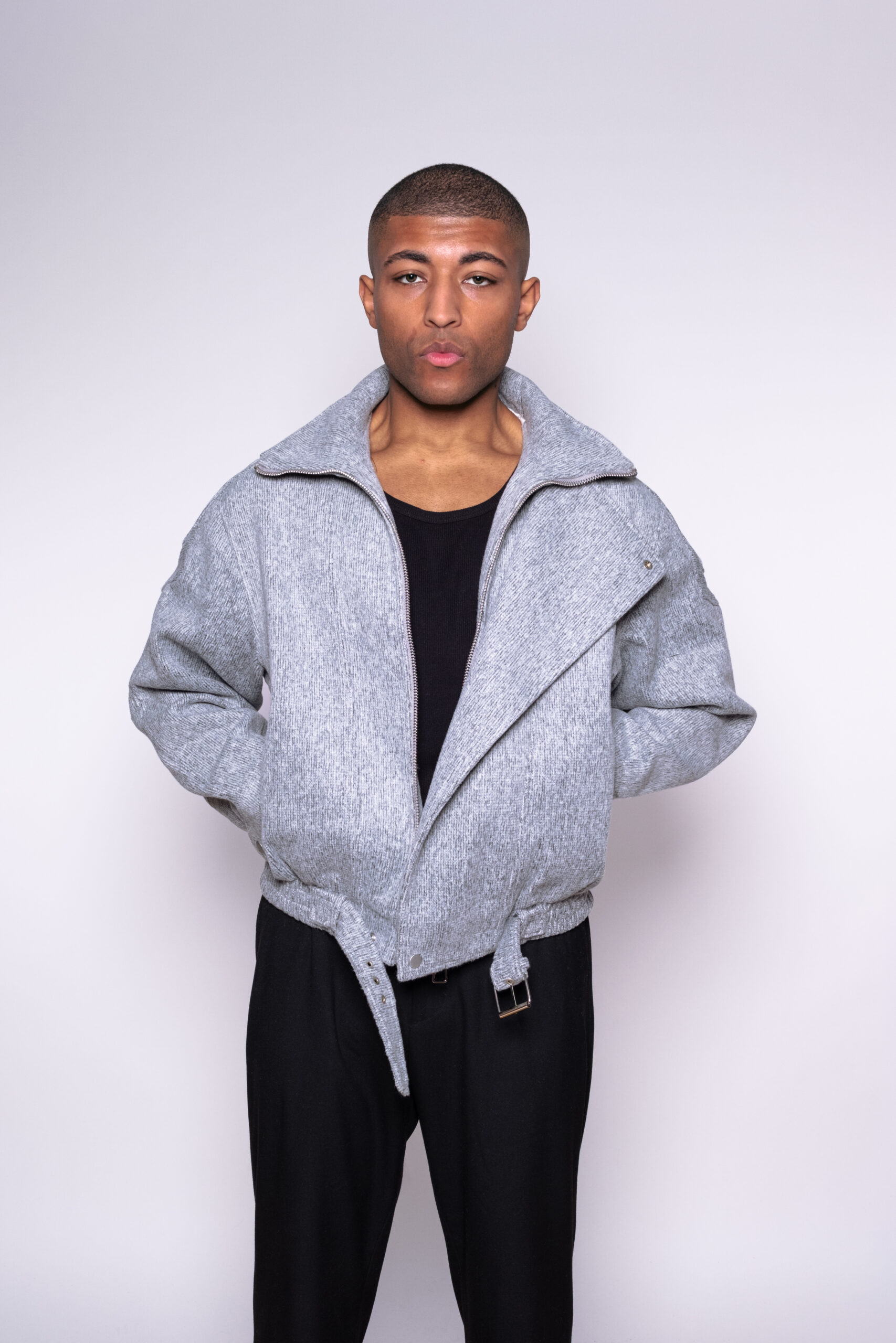 Son design minimaliste met en valeur des lignes épurées et une texture chinée subtile qui enrichit visuellement la matière. La fermeture zippée discrète et les sangles d’ajustement à la taille permettent de moduler le porté selon l’effet recherché : ample et décontracté ou plus ajusté.
